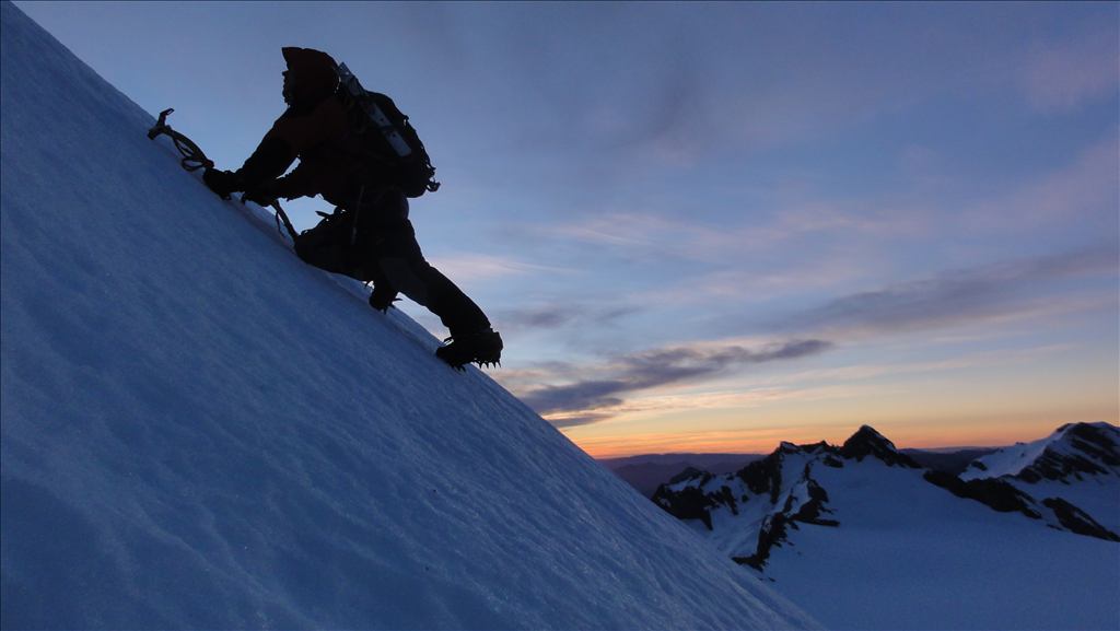 Za úsvitu následujícího dne vyrážíme k ledovci Bonar přes sedlo Quaterdeck o 800 m výše. Sníh je tvrdý, hory od vycházejícího slunce zabarvené do všceh odstínů červené, na nebi ani mráček. Po přelezu Quaterdecku se nám otvírá nádherné ledovcové plató s Aspiringem uprostřed. Můj pohled hned míří na jihozápadní hřeben, kam se zítra chystáme. 1000 m převýšení, sklon do 60 stupňů, v klíčovém místě na skalním předělu 20 metrový ledopád obtížnosti WI3. Stavíme stan nedaleko nástupu, dáváme krátkou túru k hřebeni Avalanche Peaku, tavíme sníh, jíme. Zítra budík na druhou ráno. Jako obvykle nemůžu zabrat, když v tom slyším cinkání od procházející dvojice. Za dnešek to dali od parkoviště až sem. Dobrých 25 kiláků, cca 1700 metrů převýšení, poslední výškový kilometr po pás v břečce. Vypadají jako dva přízraky co se vynořily z mlhy, která k večeru zahalila celou pláň.