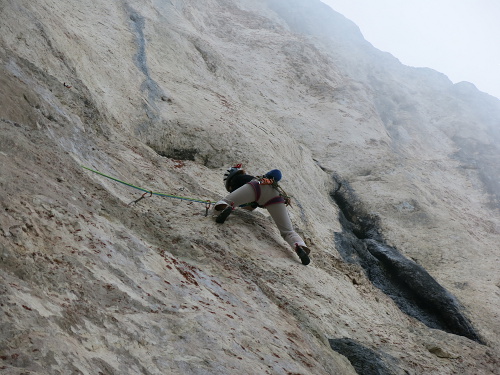 I to je jedna z nových zkušeností pro Lucku. Ve vícedélkových cestách s vysokou klasifikací prostě jen stačí nalézt k expresce z jiné strany… a o tom, že by to mohlo být na OS, si můžete nechat jen zdát. Pro mě, a zvlášť v traverzech, to byl boj. :-( O co Lucka lezla rychleji, o to já pomaleji :-). Lucka už dříve nějaké vícedélky lezla, ale těmito dvěma tak trochu symbolicky odstartovala své plány, lézt ve velkých stěnách těžké cesty.