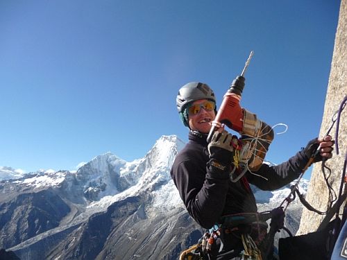 Štand čtvrté délky dávám pod výraznou plotnu, která vypadá, že bude nejtěžší délkou v cestě. Ondra vrtá první nýt a po několika pádech zjišťuje, že tudy cesta nepovede. Je kolem druhé hodiny, to tady znamená, že „vypínají topení“. Pro dnešek to balíme a jedeme dolů. Editka nám zatím uvařila večeři. Tomu říkám servis. Ondra s Editkou si pod stěnou postavili stan na jediném možném místě. Já mám o něco níž skromný bivak s výhledem na severní stěnu Huandoye. Béda marodí v BC.