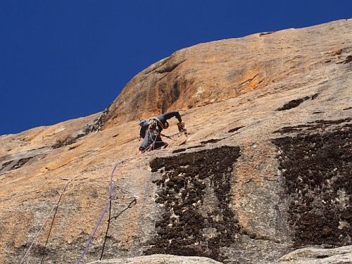 Každé z následujících tří rán probíhá stejně; snídaně, vyfunět kopec pod cestu, vyžímarovat na konec fixů a pokračovat v rozdělané práci. Ondra zkouší včerejší plotnu zleva, což se také ukazuje jako slepá ulička, a tak končíme v koutě Španělské cesty. Vybila se nám baterka vrtačky, takže štand tluče Ondra ručně. V koutě necháváme fix a frčíme dolů. Už zase přestali topit a je zima. Bédovi se zatím podařil trochu zmobilizovat síly a došel dolů pro poslední batoh, bez kterého bychom nemohli pokračovat. Je v něm další 200 metrů špagátu a jídlo. Nad koutem je úžasná plotna, na kterou se těšíme už od spodu. V ní děláme dvě délky. První vyšla na mě. Lehce položená plotna za 7a. Ondra mě povzbuzuje, ať moc nevrtám, že máme poslední baterku. To jsou rady! Takhle jsem se snad ještě nebál! S pěti nýty na padesáti metrech je to ale každopádně jedna z lépe odjištěných délek v cestě.