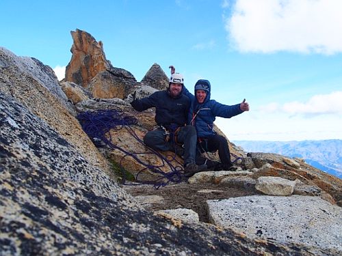 Další délku jde Ondra. Už od štandu je jasné, že nebude zadarmo. Při vrtání třetího nýtu se s Ondrou urval háček. Byla z toho pěkná „tlama“ zakončená efektním kotrmelcem, naštěstí bez vrtačky. Ondra zůstává viset hlavou dolů, rozpláclý v plotně. Jako zázrakem se mu nic nestalo a neohroženě se pouští znovu do lezení. Nakonec z toho je pěkné 7c. Délka končí na prostorné polici. Vrchol vypadá, že je na dosah. Dál už jdeme nalehko, ale bereme vrtačku. Jsou to jen tři lehčí délky. Zjišťuji ale, že i ty se s vrtačkou přes rameno lezou dost blbě.