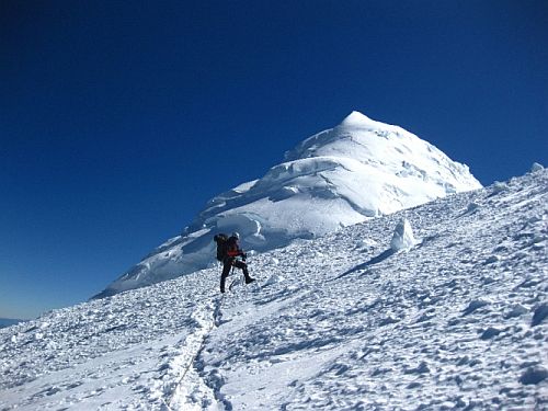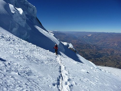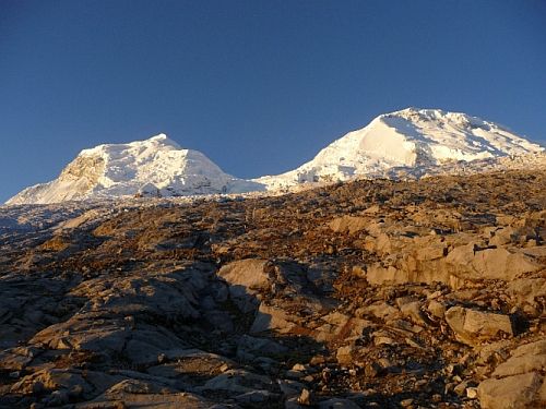 Počasí, o kterém místní říkají, že tak špatné nepamatují, se pomalu umoudřuje. Z mraků nad horami občas vykoukne i nějaký vrchol, a to je nejvyšší čas vyrazit na Huascarán. Od tohoto plánu nás domorodci zrazují, protože prý je tam spousta sněhu, trhliny co se nedají přeskočit a navíc tam letos ještě nikdo nebyl. Samé povzbuzující zprávy. My se ale nenecháváme ničím odradit a už další ráno stojíme ve vesnici Musho s brutálně těžkými batohy. Při pohledu z náměstí na vrchol je nutné fakt hodně zaklonit hlavu a my s otevřenou pusou zíráme, kam až se s „krysami“ musíme vydrápat. Normálně se z Musho do BC chodí s oslíkem, my ale tuto pomoc hrdinně odmítáme a šnečím tempem se suneme kamenitou cestou. V BC jsme asi za pět hodin. Na to, že na kopci mají být tak mizerné podmínky, je tu celkem plno. Z kuchyňského stanu zrovna šéfkuchař nese čerstvě upražený popcorn. Kroutíme nad tím hlavou a stavíme si stan na posledním volném místě mezi oslími výkaly.