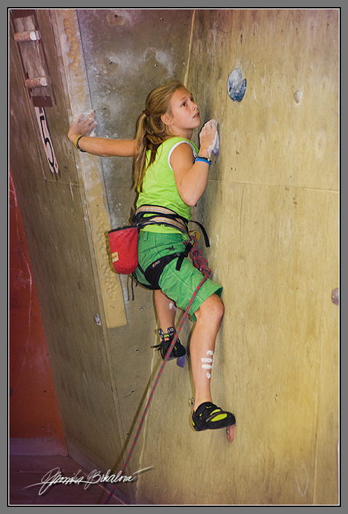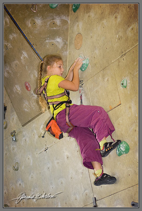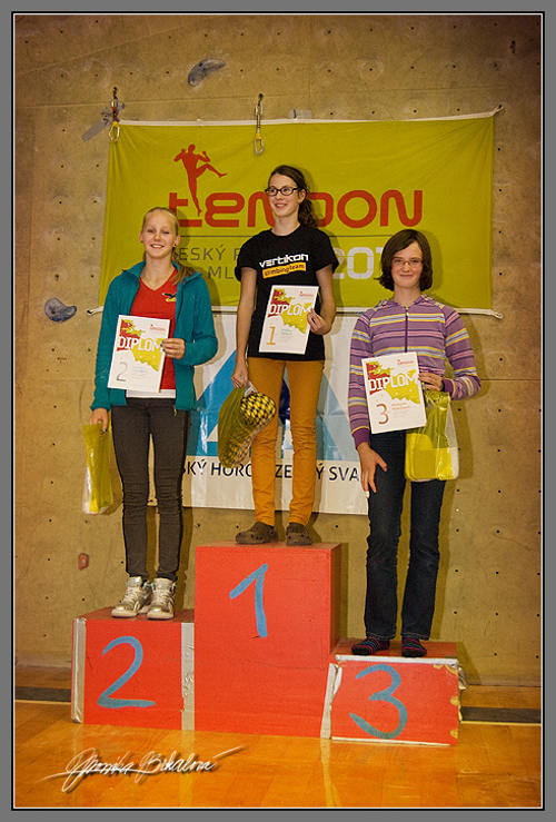 Holky na zelené finálovce taky předváděly, že lezení jim není cizí! Výkony pěkně gradovaly! Nejprve holky B svedly pěkný boj o příčku nejvyšší, Katka Zachrdlová a Eliška Vlčková, která nakonec o chyt vyhrála! Pak konečně ukázala Jana Vincourková (kategorie A), která se v kvalifikaci hodně trápila, že lézt umí, a přelezla jak mladší holky, tak spoustu kluků! Vrcholem dívčího finále byl výkon Ivy Vejmolové, která ve své kategorii vyhrála o parník a zároveň dolezla ze všech holek nejdál!