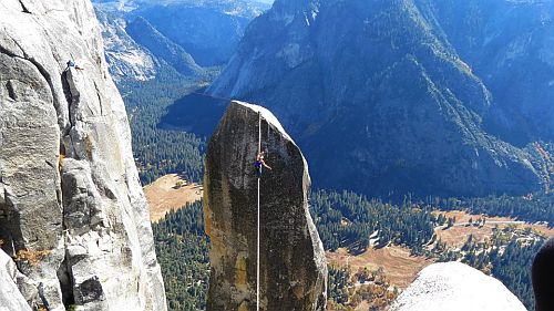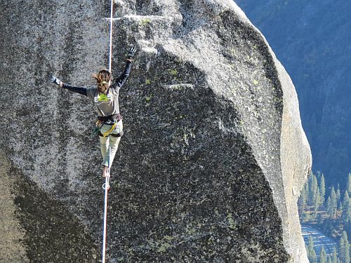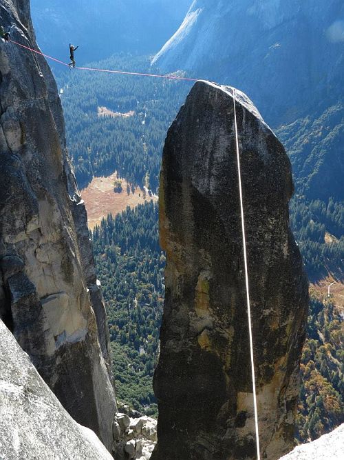 První česká highline výprava do USA splnila jeden ze svých cílů. Napnuli jsme a přešli lajny na Lost Arrow Spire a tu kratší nad Josemitským vodopádem. Bylo to 5 slunečných, větrných dní, při kterých se plnily sny. První den jsme vynesli všechny ty naše serepetičky o tisíc metrů výš. Druhý den Kwjet a Kubín vylezli na Spire, ale my zbylí jsme už mohli začít napínat protože, jsme tam měli fix od lezců, které jsme potkali předešlý den. Večer bylo skoro napnuto. Padl první přechod. Třetí den jsme jen chodili a užívali si těch nádherných lajn. Čtvrtý den jsme jsme již znali Josemitskou termiku: do devíti fučí silně dolů, pak se vítr otočí a s každou hodinou zesiluje. Když na lajnu vlezete ve čtyři, tak si budete připadat jak v pračce nebo v sušičce, no zkrátka celkem mazec. Po šesté vítr ustane. A tak jsme si ještě pochodili v klidném dopoledním větru. A pak jsme to sundali. Přešli o půl kilometru vedle a Píďa, Kubín a Kwjet napli Yosemite Waterfall line, já šla vařit večeři, protože jsem únavou sotva pletla nohama. Pátý den jsme chodili tu super-exponovanou lajnu a bavili se s udivenýma turistama. Šestý den jsem sbalili lajnu a kemp a šupajdili do údolí. Den po našem návratu a po týdnu v tričku nám nasněžilo.