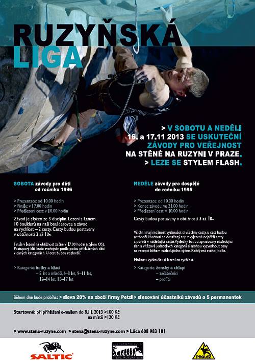 V sobotu a neděli 16. - 17. 11. 2013 se uskuteční závody pro veřejnost na stěně na Ruzyni v Praze. Leze se stylem Flash.