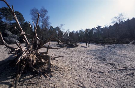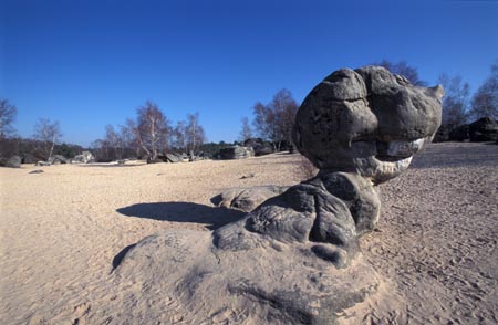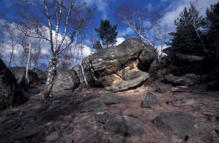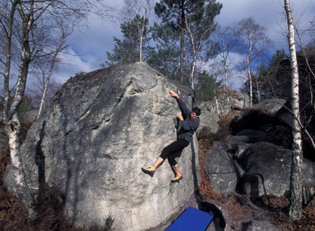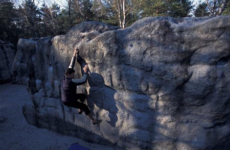 Mimochodem, když teď sedíme ve vyhřátém autě a přejíždíme z oblasti do oblasti, řekněme si něco obecnějšího o Fontainebleau. Jedná se o proslulou boulderingovou oblast, nacházející se kousek východně od Paříže. Byly o ní popsány stohy papíru a jistě i webovských stránek (sám náčelník jistě již na tomto serveru zveřejnil nějakou faktografickou reportáž doplněnou do nejmenších podrobností dokonalými schématy). Podívejme se však na tuto oblast z pohledu svátečního (nebo spíš velmi svátečního) lezce, tedy pohledem zcela nezaujatým. Jedná se v podstatě poměrně rozlehlý národní park, který je tvořen lesy a písčitými moři, vyplněnými různě velkými a různě velikými pískovcovými kameny. Jedná se vlastně o obrovskou zpevněnou pískovcovcovou desku, která kdysi spočívala na písečném dně (podkladu) a která se v průběhu různých geologických období začala rozpadat a odlomené bloky se kutálely až na místa, kde spočívají dodnes. Krajina je to opravdu velmi krásná, a kromě lezců přitahuje i spoustu turistů a cykloturistů, kterým poskytuje rozmanité možnosti pro rozmanité výlety. Nejvíce však oblast přitahuje lezce a zvláště pak odrůdu lezců nazývaných bouldraře, kteří zde na nevelkých kamenech dokáží neuvěřitelné věci. Jednoduše řečeno, kromě mouchy a boulderisty se na některých kamenech neudrží dokonce ani lišejník. Zajímavé je, že nejvhodnější čas pro špičkové výkony je brzy na jaře, neboť je ještě dostatečná zima na to, aby jste díky promrzlým rukám necítili rozedřené prsty. V létě je zde prý velmi horko, takže se ruce potí a výkonnost tím klesá – tak pravil náčelník.