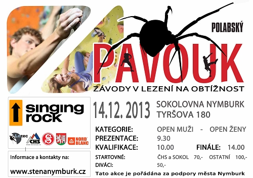 Nymburská sokolovna se v sobotu 14. prosince stane dějištěm čtvrtého ročníku oblíbených závodů v lezení na obtížnost s názvem Polabský pavouk 2013. V kategoriích muži open a ženy open si mohou zazávodit všichni, kdo mají rádi lezecký sport. Organizátoři i letos připravili vložený závod v "něčem", nechte se překvapit. Prezence závodníků je od 9:30. Čekají vás dvě kvalifikační, jedna finálová a jedna superfinálová cesta, lezená tentokrát z izolace. Občerstvení, muzika i možnost přespat do neděle ve vlastním spacáku. To všechno je Polabský pavouk 2013. těšíme se na vás. Zájemci o účast na závodech se mohou hlásit Mamutovi na níže uvedený e-mail, ale není to podmínkou.