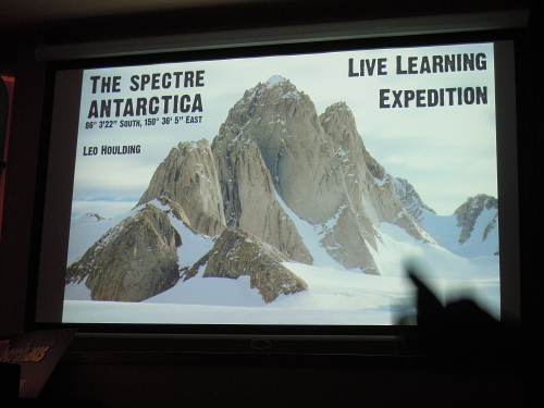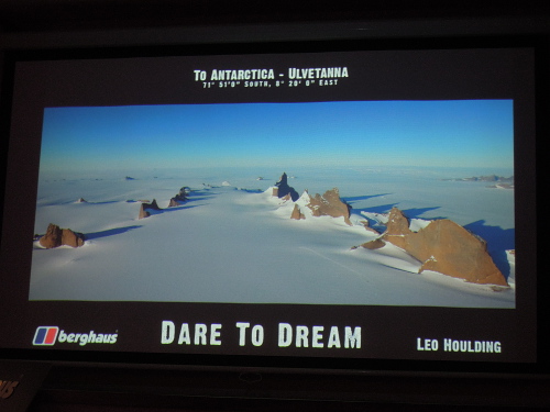 Leo také povídal o lezení v Yosemitech, kde se sice dají potkat skvělí kamarádi a polulezci, ale přeci jsou to bigwally, kde vás může někdo zachránit. To už se třeba o horké Amazonii nebo mrazivé Antarktidě tvrdit nedá. Ale to, že třeba na Autanu jim výstup musel dovolit místní šaman, není nic proti už samotné existenci, práci a lezní na Antarktidě (jak jsem se mohl dozvědět i nedávno na přednášce Čestmíra Lukeše, který zde má také několik prvovýstupů), kde jste sami, lézt sem jezdí jen skupiny horolezců, protože lezecká dvojka by se i po malé nehodě jen těžko dokázala zachránit a skály jsou zde na povrchu zvětralé, místy nezajistitelné. Antarktida je velmi drsná země, v současné době se sem dá dostat letadlem přes ruskou agenturu, což stojí nemálo peněz, ale servis je vynikající - předpověď počasí, bezpečnost návštěvníků (každodenní kontakt vysílačkou) i vývoz odpadů podléhá přísným pravidlům, aby zde šlo vůbec existovat. Leo říkal, že loňský prvovýstup na Ulvetannu v Antarktidě (na vrchol už vylezli např. Huberovci), kterou kdosi vyfotografoval poprvé v osmdesátých letech a jejíž obrázek mu učaroval, byl určitě zatím tím nejsilnějším zážitkem: "..it's in the middle fucking nothing!". Odtud i název nového filmu The Last Great Climb. Výstupu na Ulvetannu věnoval Leo velkou část přednášky, ukázal nám i seznam materiálu vážícího stovky kil. Nahoru jich lezlo celkem pět a když přelezli po hřebeni pod druhou kolmou část stěny, absolvovlai ještě vynášku nezbytného materiálu do bivaku a po dalším lezení a natáčení všichni úspěšně vystoupili na vrchol. Leo tentokrát dolů nesletěl, i když by to bylo rychlé a krásné, ale slanil férově společně dolů ve zdraví s ostatními spolulezci.