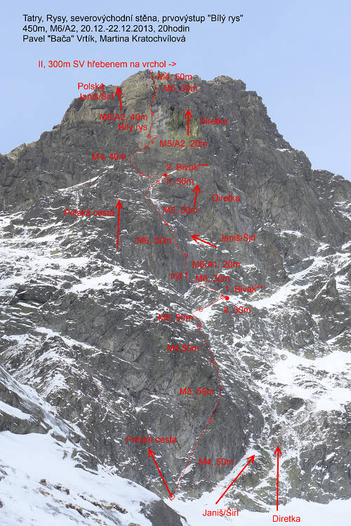 Prvovýstup v severovýchodní stěně Rysů. Výstup vede v horní části přes obrovský převislý výlom bílé barvy, a proto cesta dostala název „Bílý rys“. Po 13 lezeckých délkách v max. obtížnosti M6/A2 následuje 300m dolez hřebenem na vrchol. Lezeno 20h během 3 dní (20.12.-22.12.2013). Dva bivaky ve stěně, krátké dny a dlouhý nástup z Popradského plesa dodávají cestě alpský charakter. Linie prvovýstupu vede vlevo od Direttissimy Kulhavý/Sulovský/Hendrych a v horní části překonává ten největší převis.
