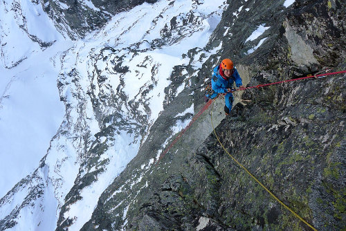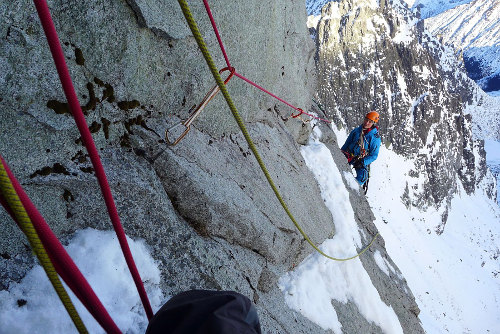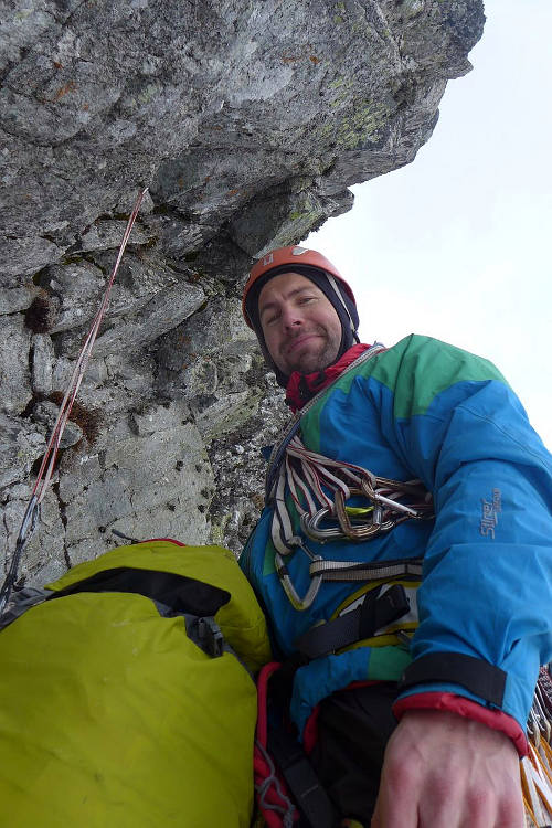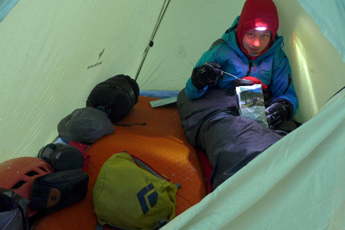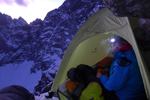 První délky lezeme s batohy na zádech a člověk má aspoň možnost si zanadávat, že ten po***nej batoh zas zavazí. Čtvrtou délku už lezeme potmě, ale zase nám všechno skvěle vychází, takže štandujeme ve sněhovisku dost širokém na to, abychom tam vykopali místo na stan.