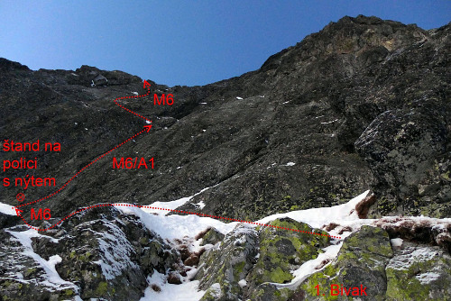 Ve čtvrtek večer přijíždíme na Popradský a dozvídáme se, k mému milému a Bačově nemilému překvapení, že tatranci Meďo a Tono Suchý polezou cestu vedle nás. Jebača se zmůže pouze na "Tak já jdu schválně do stěny, kde 30 let nikdo nebyl, navodit trošku atmosféru totálního zatracení a voni nás musí hned jít zkontrolovat, jestli jim to tam nechcem nějak vošulit." Ráno klasická vstávačka ve 4:30, a můžem vyrazit. Mou spásou je, že Bača naznal, že bude muset nést všechno on, protože já nic neunesu a ještě jsme stylově nabalili tak, aby to vypadalo, že já toho mám mnohem víc. Pětihodinový nástup s krásným východem slunce a už koukáme do naší cesty. Bílý výlom, kterým má vést naše klíčová délka, vypadá monumentálně a my se se znovu nabitou lezeckou nadržeností rozbíháme do posledních 150 metrů našeho nástupu, abychom se už konečně dostali k prvním délkám cesty. Naše nadšení, ale po chvíli opadá, když stále šlapeme na stejném místě v krupicovém sněhu a pod záminkou hledání směru pro další dny odpočíváme. Nakonec se probijeme ke skále a Bača si to už hrne první délkou a vymýšlí kudy se z mírně převislé, ale docela rozbité stěnky vymotat. Já ho bouřlivě podporuju, jak mu to pěkně jde, a věnuju se vyklepávání částí skeletu z návleků. Z těch se mi během nástupu staly polobotky, protože celý horní plast nad kotníkem se rozpadl. Co už.