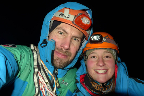 Pak mi ještě skoro pomočí boty na štandu a vrháme se do posledních dvou délek, ze kterých se dostáváme na hřebínek vedoucí na vrchol. Asi po 50 metrech dupání ve sněhu narážíme na stopu prošlapanou od kluků a za tmy se dostáváme na vrchol. Fotíme se, ale jediný, co mi běží hlavou je, jak jsem ráda, že jsem tam, kde jsem. Vlevo od nás svítí Polsko, vpravo Slovensko a uprostřed toho tiše leží zasněžené Tatry osvícené měsícem a sem tam nějakou tečkou čelovky.