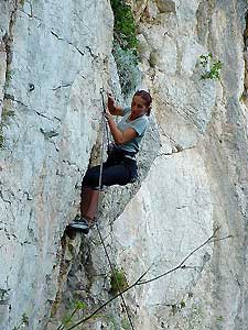 My jsme si vybrali lezení nejdříve na Paroi du Fortu. Sem se dostanete, jak jsem již napsal, poměrně strmou cestou, kterou se vám podaří najít, při troše štěstí, hned vlevo, když projdete vysekaným tunýlkem. Když při sestupu potkáte řetěz, tak jste dobře. Přijdete nejdříve do sektoru Paroi du Fort. Zde jsou kolmé dosti kompaktní cesty, místy stěnu předěluje převis. Levá část je kompaktní, dominantní a vyžaduje dobrou techniku a silné prsty. Pravá část je lehčí a nabízí lezení v kolmých stěnách strukturovaných v kouty a hrany. Nížeji se můžete přesunout do sektoru Big Ben. Zde jsou těžší cesty a horní část stěny vás donutí k pěknému záklonu.
