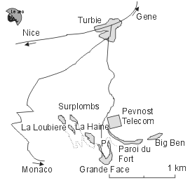 Výchozím bodem, je parkoviště na skalním ostrohu u areálu Telecomu France nad vesnicí Turbia. Zde je možné většinou zanechat auto a vydat se na cestu k některému ze sektorů. Je snad dobré podotknout, že se nalézáte v jižní Francii, proto tedy nic z toho, co by mohlo lákat poberty,  nenechávat v autě.