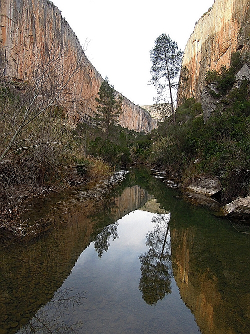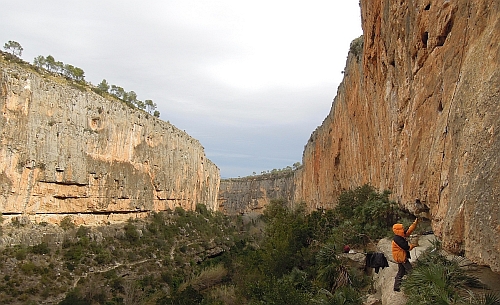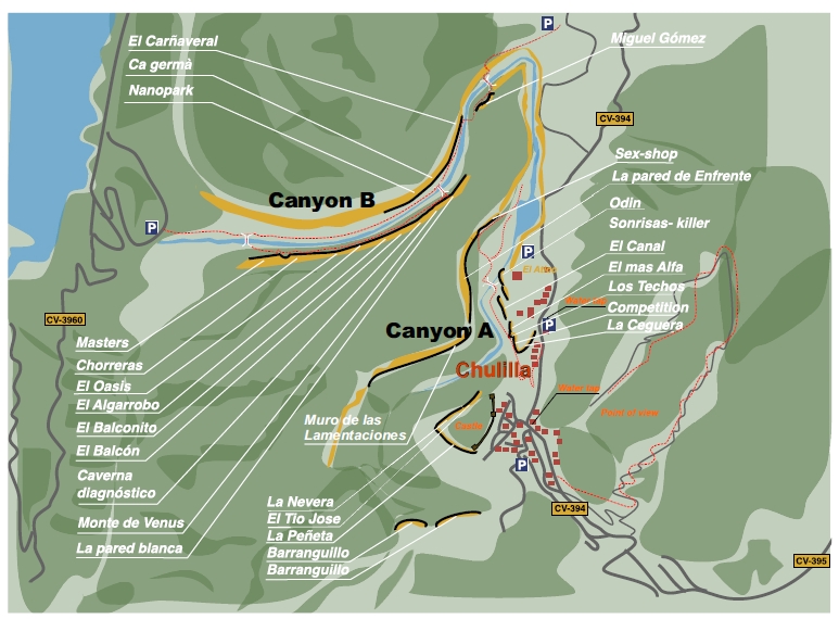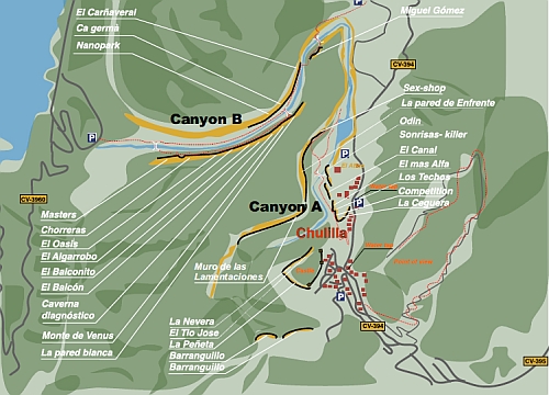 Jak jsem zmínil výše, jedná se vlastně o dva paralelní kaňony, pro jednoduchost je můžeme nazvat Kaňon A a Kaňon B (je to čistě rozlišovací označení). Kaňon B si možná řekne, že pokud je to čistě rozlišovací označení, tak proč zrovna on je Béčko? Ale je to proto, že ten A - je ten, který se vám jako první zjeví, když přijdete do Chulilly po silnici. Je více otevřený s jednou horou, na které je hrad a na které se také kolem dokola leze. Navíc další stěny jsou i všude za meandrem říčky, která obtéká skálu, na které je hrad. Ten druhý pod velkou přehradní nádrží je více skryt, je užší, drsnější a možná právě proto o něco méně navštěvovaný a jednoznačně s obtížnějším průměrem cest.