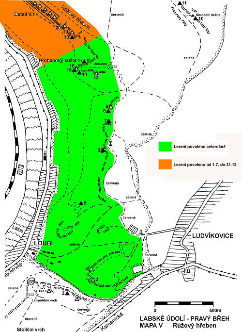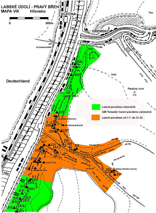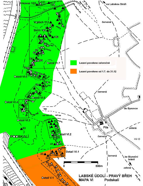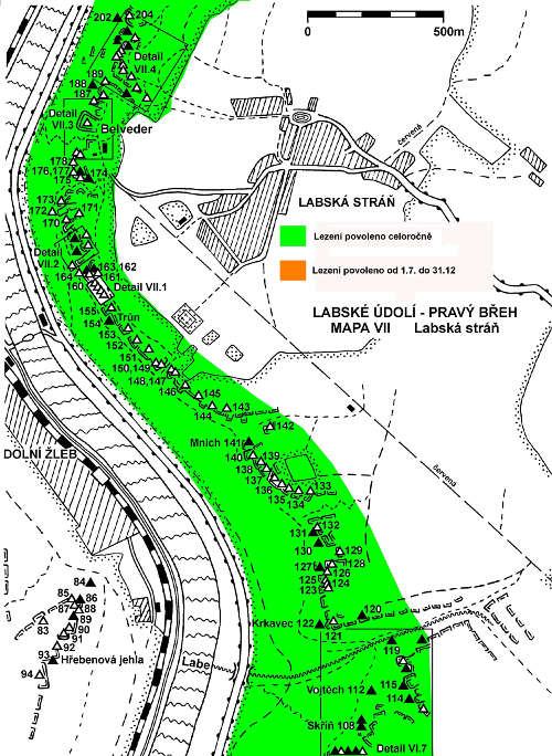 Bitte beachten Sie, die regelmäßigen Schließungen von 1. 1. bis 30. 6. jedes Jahr im einigen Sektoren im Elbtal auf dem rechten Ufer. Es handelt sich um Dürrkamnitzgrund (etwa zwischen Eckturm und Cestář Kabourek) und Rosenkamm (etwa zwischen Mlýnský pytel - Golem). Für die klare Begrenzung der Sektoren siehe beiliegende Karte - grün zeigt die ganzjährige Genehmigung, orange die Sperrung. Die Schließung ist unter den Bedingungen der NPR, der Grund ist unter anderem, nisten der Wanderfalken und Schwarzstorch.