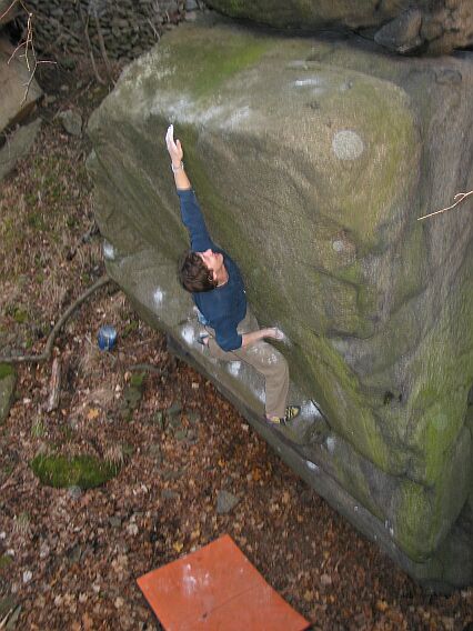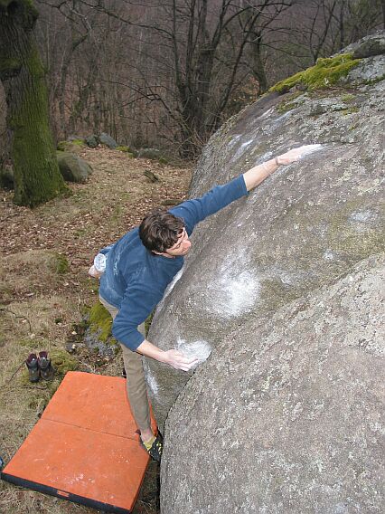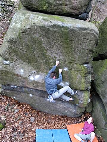 e) Mlynář 7a SD (z boulí vpravo traverz po hraně doleva a výlez a))