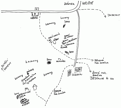 Zaparkuje se u hřbitova a dále se přibližně podle nákresu dojde k jednotlivým zatím zprovozněným šutrům. Výrazným orientačním bodem je „Hřbet“, což je oblá z jedné strany převislá hrana výšky zhruba 6 metrů. Kousek za ním (ideální je kamennou spleť celou obejít) se vystoupá až takřka k vrcholu, kde je většina kamenů. Díky poloze při vrcholu kopce jsou tu bouldery velmi brzy po dešti suché.
