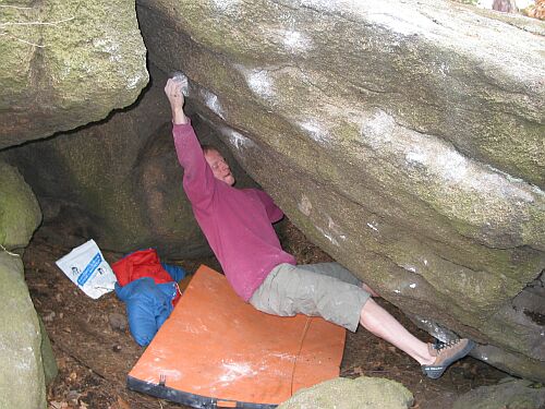 jeskyňka ukrytá v kamenech ukrývá jedinečný směr se silovým lezením v převisu