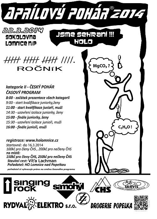 Jenom pro detailisty uvádím ukončení prezentace, jelikož již několik let to na plakáty neuvádíme!Vzhledem k lezení "před zraky" není potřeba dramatizovat nějaké nahánění do izolace, tak stačí, když poslední opozdilci dorazej 15min. před zahájením závodu své kategorie!!!