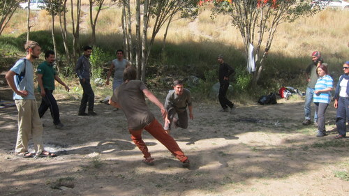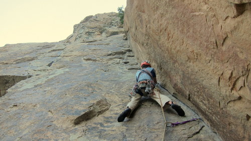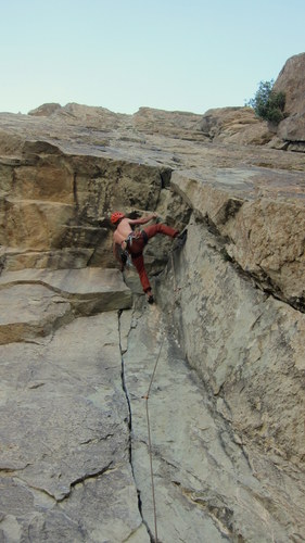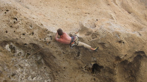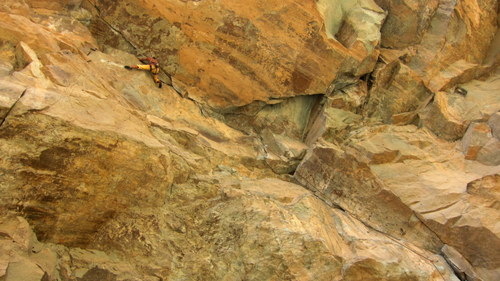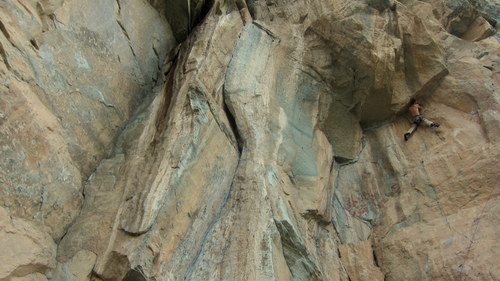 Pol-e-khab. Vesnička v úzkém údolí, řeka, milión zevlících irančanačanů, vedro, auta, mustafa café, holé vypečené kopce a- skály! Asi nějaký tvrdý písek, takhle si představuju Utah. Většina cest vynýtovaných, byť lehce podivně. Většinou převis a roztodivné spárky. To se mi líbilo. Sokolíky, prstíčky, baletění a síla. Občas lišty, plotny, kouty. Přítomna hnusná úchylka v nýtových žebřících na technické lezení vedle volně lezitelných cest. Příliš tady nepronikl „západní“ styl lezení. Iráni mají často špičkové drahé vybavení, ale příliš ho neždímají a sedí. Popř. hákují. Klukům jsme moc radost neudělali s tím, že jsme všechny cesty bez postranních úmyslů deklasovali o 1-3 fr. stupně. Vysvětluji si to tím, že Irán je hodně izolovaná země dík mezinárodním i vnitrostátním embargům. Současné vlivy dovnitř sice proniknou, nicméně velmi často jsou neúplné, popř. zdeformované.