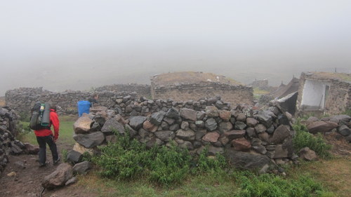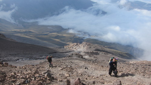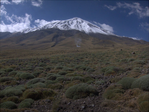 Mírně jsme tedy pozevlili, pekelně dobře se najedli a další den ráno jsme se s motákem hlavy (zkuste popíjet se slováky, že) vydali pod nejvyšší hroudu Iránu a Blízkého Východu- Damavand (5 610). Dle doporučení místního borce pouze nalehko, bez stanu a vařiče. Žďárák a jídlo na cca 3-4 dny. Vybrali jsme severní stranu. Jednak je asi nejzajímavější, je tam nejméně lidí, no a hlavně se zde nevybírá žádný poplatek :-D Tak- den bloudění v mlze, nevyspání, dehydratace, správná stezka, výšková nemoc, shelter 2 asi v 4 900 a 32 Iračančanů. Kluci výškou padli a já mohl sníst všechny dobroty, kterými jsme byli obdarováni. Ráno se na nás směje zbrusu nová sněhová pokrývka, vítr a mlha. Z místních to všichni balí. Pitris vypadá, že umře. Vojta tež, ale jako zodpovědní kucí to přece jen jdeme zkusit nahoru. Po nějaké době se musíme rozdělit. Po okraji vrcholového kráteru tak bloudím sám. Málem mi praskne hlava ze sirných výparů. Šup rychle dolů, do shelteru 1, kde je víc kyslíku. Pitrisovi se udělalo lépe, ale zato přišel o trenky, když podcenil sílu svých střevních plynů :-) Při západu slunce P valí na flétnu, doprovázím ho štěrkovým tancem. V noci mě probouzí bolest oka. Ale ať ho mnu, jak chci, nic v něm nemám. Lehký zánět spojivek. Naštěstí náš zdravoťák má vše potřebné. Další den sestupujeme v překrásném počasí po nádherné náhorní planině. Z Nandalu stopujeme ochotného dědu a pak pár hodin stopnutou cisternou až do Teheránu.
