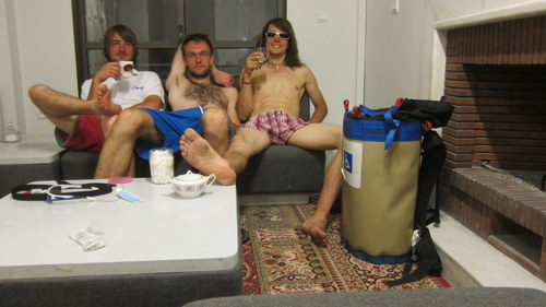 Obrysy výletu se pořádně zhmotnily až při balení. V tento okamžik byly konečně definitivně zavrhnuty mačky, cepíny a příslušející srandy, takže nikdo nemusel odjíždět s vidinou bídné smrti ve zmrzlých gruzínských horách. Menší boj, způsobený úchylnou touhou po co nejlehčí výbavě (já) vs. touhou po co nejlepším ošefování všeho (P+V), skončil. Rozpůlili jsme dalekohled.
