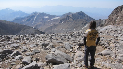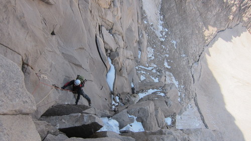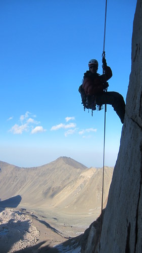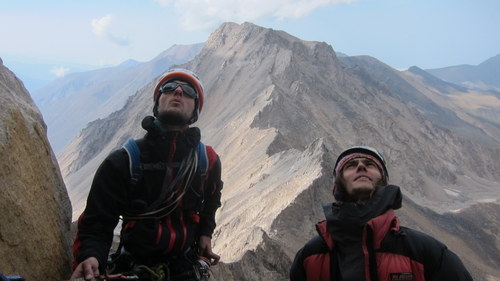 Nasim, Pitris a já jsme třeba ve tři hodiny konečně stanuli pod severkou Alamu. Ej jaké bylo naše rozčarování, když jsme ji viděli! Stěna pěkná, což o to, bohužel zvící výšky pouze asi 421 metrů. Zkrátka totok nezavánělo slibovaným bigwallem. Druhý den jsme se rozlezli v jedné z lehčích cest- Rhost/Alaie. Bulvy jsme začali valit již na nástupu, který byl značně erodovaný. Kolem popadávaly kameny ze stěny a byla zde natažena fixní lana- staré kroucené plastiky, pseudokotvené kupř. v jedné nepěkné skobě. Naše cesta byla značně nevyvážená-lehčí úseky maximálních obtíží asi 5+ UIAA se střídaly s technickými úseky asi A1/A2, popř. se sněhovými poli. Osypku jsme ovšem měli právě z těch plastových lan, které se průběžně zjevovaly. Toto jsem ještě nikde jinde neviděl (a moc jsem toho neviděl!). Iránci jsou schopni po těchto rakovinách šplhat i volné úseky a čistší lezení, jakož i bezpečnost, jim asi moc neříká. Že se to nevyplácí, bylo patrno, když v předešlý den spadl z normálky jeden z průvodců po použití starých fixů. Na vrchol jsme se prozatím nevyplazili, jelikož skála posledních délek měla výběrovou kvalitu kypřícího prášku. Vršek zatím neměl žádnou prioritu.