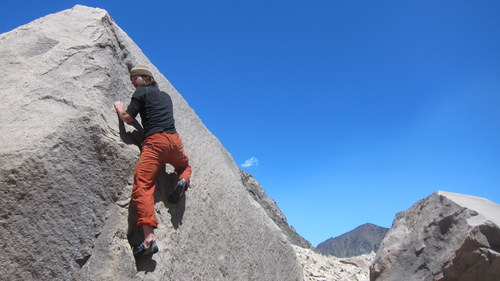 Večer se trochu jamovalo a ráno se šlo lézt. Hamedan je v prvních asi 5 délkách velmi pěkné lezení. To, že místo nejtěžší délky za 7a+/7b šlo o asi 6b+, jsme přešli. Ale lezení A2 místo 6b+ už nás fest nakrklo. Díky podobným okolostojíčnostem jsme se hore vyškrábali pozdě v noci, v zimě a větru. Přešli jsme přes hřeben do plechového bivaku a jali se nouzově přespat. Došla nám voda i jídlo a komunikace s Nasim docela zamrzla. Skopali jsme se dolů, zničení jak kecky. O to větší úlevu jsem pocítil, když v táboře čekal vytlemený Vojta. Jeho příběh byl plný srajdy, dehydratace, infuzí a vzkřísení. Teď stál téměř, téměř v plné síle natěšený na lezení. O to horší mu bylo sdělit, že do té posrané stěny už jen tak nevlezeme. Únava, strach z lokrů a zklamání ze stěny prostě vyžadovalo odpočinek. V následujících dnech ovšem foukal takový vichr, že nám jednu noc i převrátil stan nad hlavami. Trochu bouldrování, experimenty s iránskou kuchyní (ta tradiční je vážně moc moc dobrá!) a šup zpět do Pol-e-khabu, konečně udělat nějakou liňajku.