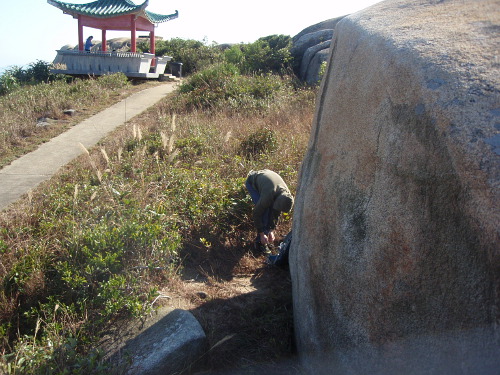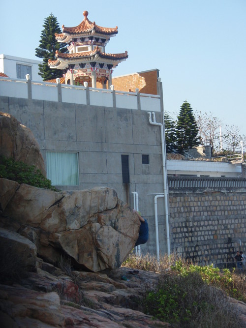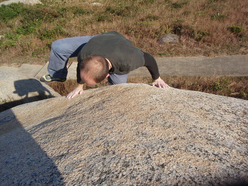 Pokračujeme po cestě okolo ostrova skrz banánovníkové háje a ospalé vesničky. Pak zatáčíme doprava do schodů a jdem asi kilometr až na vrchol kopce Ling Kok Shan. Jsou tady nádherné balvany, které nejsou vůbec zakresleny v průvodci. Asi se na ně občas leze, ale místní nechtějí, aby se tu rozjel velký bolderingový boom, tak je nezveřejňují. Starší směry jsou v průvodci zakreslené, a nakonec je zvládáme najít. Dotýkám se skály. Konečně pár boulderů po nemoci na rozlez. Doslova hojivý dotyk kvalitní žuly. Se zavřenýma očima si člověk skoro myslí, že je zase doma někde na Petráči, asi takový je charakter zdejších boulderů. Nejdéle jsme zůstali v sektoru Pagoda boulders (jméno podle pagodového altánu pro turisty - viz foto níže).