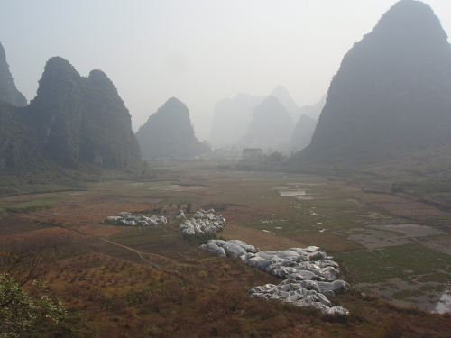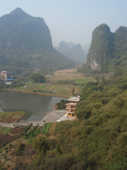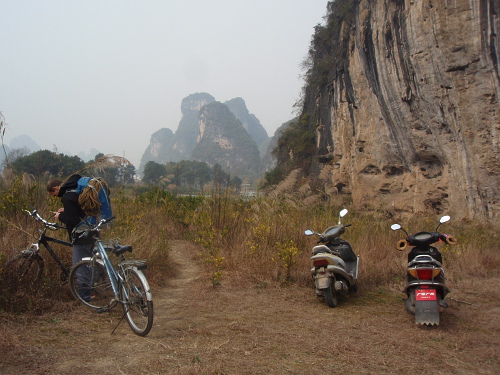 Po příjezdu si dáváme místní knedlíčky Jiaozi a trochu se jimi zahřejem. Nikde tu totiž nevlastní topení. Všichni mají klimatizaci a těch pár studenějších týdnů v prosinci se prý nějak přečká (hahaha). Je dopoledne, tak si půjčujem dvě růžový kola za dvacet čínskejch (30 Kč jedno) a vyrážíme k oblasti Wine bottle. Průvodce má Eliška už od průzkumné výpravy z podzimních prázdnin. Je na místní poměry dost dobrej a mají ho tu všude na krámech a neustále vylepšujou. Frčíme na kolech ve slušným provozu přes město a s každou projetou křižovatkou dostáváme víc řidičského sebevědomí. (Opravdu tu není jediné pravidlo, které by se na silnici striktně dodržovalo - snad jen obecná opatrnost.) Za chvíli jsme v kopcích. Celé je to tu rovina ze které vystupují rovnou kolmé stěny místních bizarních vápencových homolí, takže kolo je rozhodně parádní prostředek, který vás dopraví většinou až k nástupu po rovině. Míjíme skálu, kde pár Číňanů provozuje rybaření na skále pro turisty za úplatu. Jejich mentalita je podobná mentalitě šerpů na Everestu, takže těch pár cest se prostě jen rybaří a pokud jim do cest nalezete, budou se k vám chovat asi jako ti z Everestu k Uelimu Steckovi. Skal je tu naštěstí hafo, tak razíme dál na hledanou Wine bottle. Nemůžu to moc porovnat, protože jsem nikdy nelezl ve Špáňu ani v Řecku, ale skála je prostě nádherná. 30 m dlouhé lajny občas s krápníky. Skála je skvělá a začíná být i teplo. Na sluníčku něco mezi 15 a 20 stupni. Lezu pár cest do 6c+ na rozlez. Eliška po půlroce nelezení dává nějaké ty 5b-c. Vracíme se nadšení do města. Večer se zase dost ochlazuje a je skoro nula. Máme pěkný pokoj, ale je v něm také nula. Jediné teplo je v posteli, kterou Číňani rádi vylepšují elektrickými dečkami na zahřátí. Je to trochu zvláštní, ale celý týden tady strávíme v režimu jak někde na vandru v tatrách. Buď spíme, nebo jíme, nebo lezem. Lelkování se dá provozovat jen v péřovkách. Ideální na lezeckou návštěvu je tedy spíše konec podzimu a začátek jara. Ale my jsme si to užili i tak. Další dny bylo na skalách vždy příjemných 20 °C na jižních stěnách. Lezli jsme 6 dní v kuse a snažili se navštívit co nejvíc oblastí. Hlavně těch vyhlášených. S lezením se tu začalo někdy v 90. letech a zavlekli ho sem samozřejmě bledé tváře. Tod Skinner s parťáky udělal místní sportovní klasiky v obřím oblouku na Moon Hillu (tam jsme strávili Štědrý den). Přijde mi, že už moc plkám, a tak přidávám několik dalších fotek...