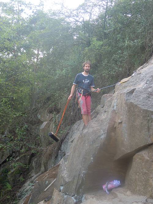 A pak je to hlavně ta duše každé jedné konkrétní skály, kterou vidí různí lezci jinak. Kde se bude/nebude dát lézt, kde dělat zdola, kde shora, kolik cest a jak daleko od sebe ještě můžou být, jak daleko má být jištění, jestli je tam něco nebezpečného, jestli je třeba chyty omést, kde a jak budou cesty končit,… A taky by si měl každý ujasnit další věci: pro koho to bude, jestli pro zkušené lezce, co si poradí se vším, jestli je to oblast tradiční nebo sportovní, nebo jestli je to sektor pro děti (které nedosáhnou tak vysoko, některé stupy nebo chyty jsou pro ně daleko a i poměr výška lezce a hloubka pádu je jiný). Je kravina dělat cestu po vlastním jištění ve sportovní oblasti, stejně jako vlítnout někam do klasik a cosi tam vynýtovat, ne všude se to hodí. Chce to cit a taky i poznat zdejší lezce, prvovýstupce nebo správce. Často jsem narazil na fajn lidi, kteří mi třeba i ukázali nějaké volné směry, což je důležité, aby člověk něco nepokaňhal nebo se s tím nemusel zdržovat, ale i hledání volných míst je pěkné. „Nazdár, co děláš? Nebudeš tomu věřit, co jsem našel tam a tam!“...