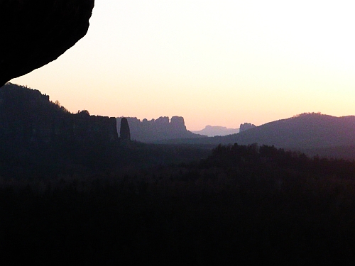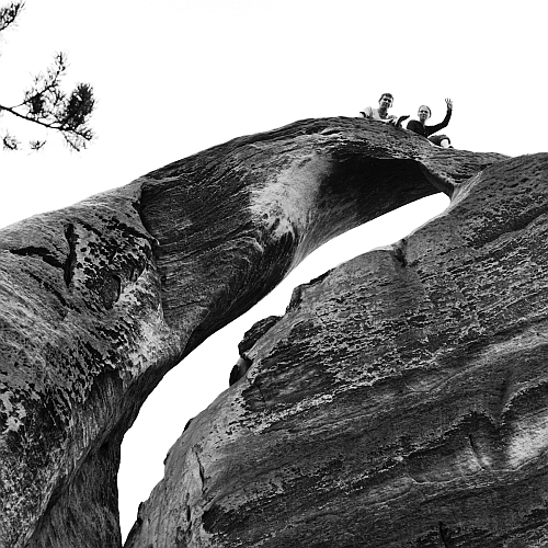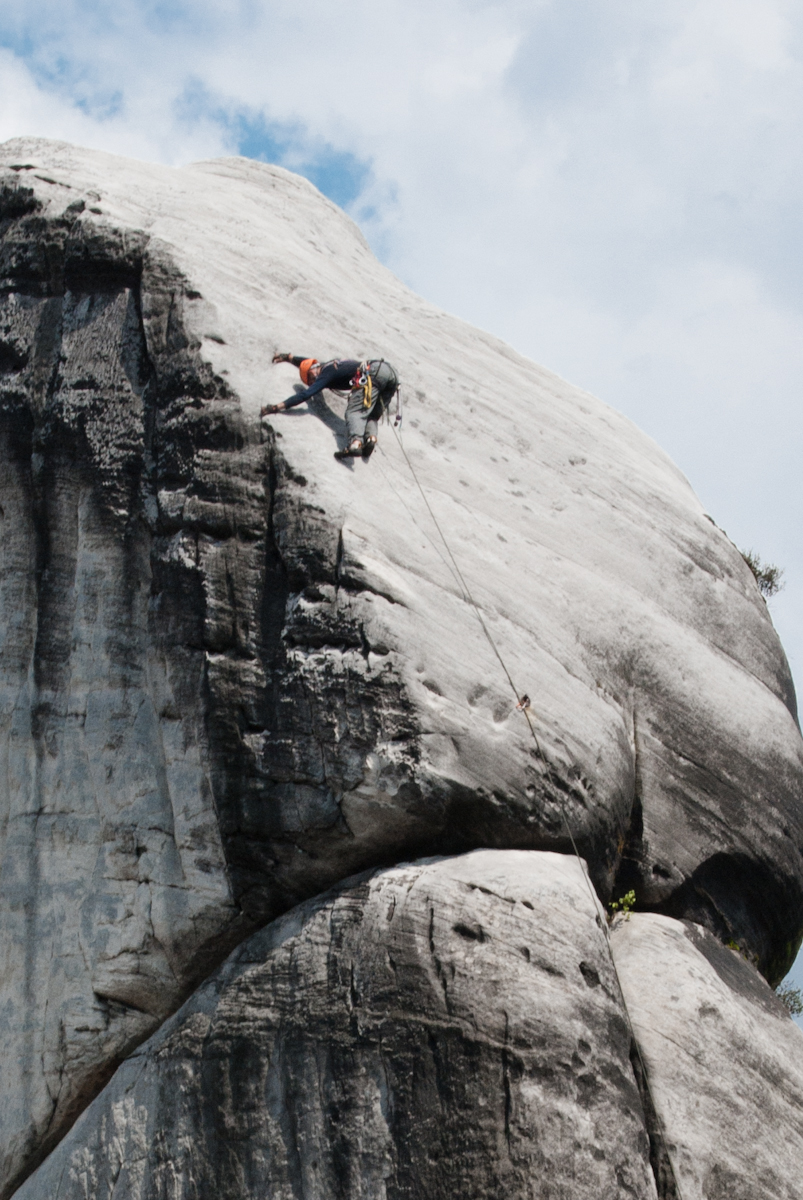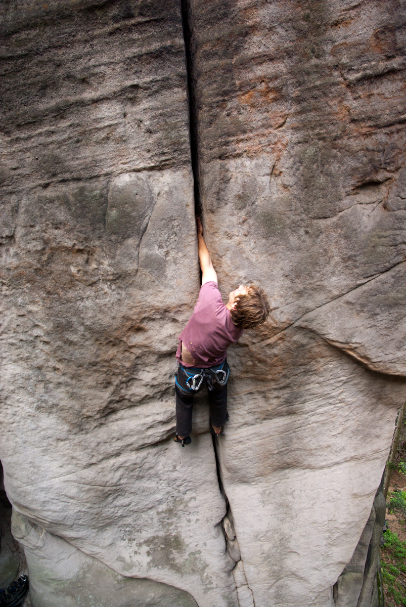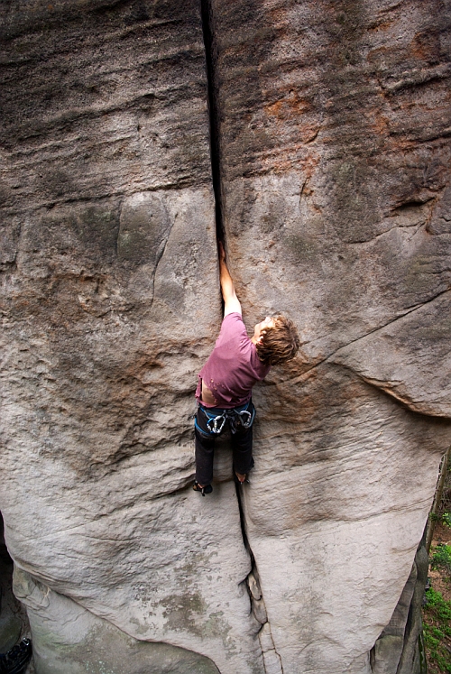 Někomu je teda úplně jedno, jestli jeho cesta vede na masiv a končí v borůvčí, u zábradlí turistické pěšiny nebo u svodidel rychlostní silnice pro motorová vozidla. Hlavně v klidu cvaknou slaňák a jede se dolů. Nic proti, když je kolem nuly nebo bych se měl po třiceti metrech vyrovnaného lezení za IXa štrachat nějakým bordelem přes 5 pilířů a 4 předvrcholy na ten jediný nejvyšší, tak už se také raději vidím oběma nohama zpátky dole, na pevné zemi. Ale stejně má vrchol pískovcové věže svoje kouzlo. Jsi nahoře, výš už to nejde, pohodlně se můžeš usadit na skalní hranu a do všech stran máš krásný výhled. Čím jsou všechny stěny tvojí věže obtížnější, čím je vrchol hůře dostupný, tím lepší bývá pocit. A když se doštracháš až k vrcholové knize, příjde ten okamžik, co ho mám tak rád - skřípání zatuhlého víčka, vyklepávání kraťoučkého špalíčku tužky, zvědavé obracení stránek, zápis.