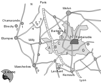 Jeďte po dálnici Autoroute du North do Paříže. Napojte se na novou dálnici La Franciliene číslo 411 okolo Paříže. Okolo Melunu byste měli narazit na směr Autoroute du Soleil (to je ta na jih směřující dálnice č. A6 na Lyon). Pak jen jeď po ní a sleduj nápis Fontainebleau. úsek Lille-Paris je € 11,- úsek Chalon-Reims-Paris neco přes 20 €.