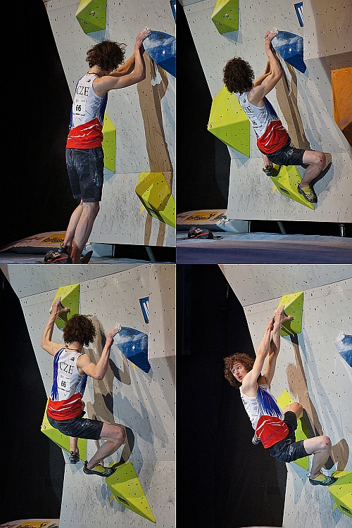 Adam ve flash přelezu druhého finálového boulderu, na kterém si většina finalistů (kromě Kiliho) vylámala zuby.