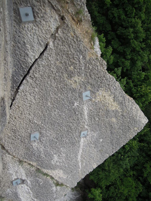 Nad skalami je zrekonstruované oplocení. Horní hrany převisů jsou očištěné, na části je v pletivu zabalená jakás asi květenu podporující zemina (protierozní sítě Biotec). Pod převisy na okraji lesíka na ochranném valu u dětského hřiště je nový masivní plot z fošen. Zasíťovaná vypadá nově také část ploten za kostelíkem. - viz zakázka Zabezpečení dětského hřiště