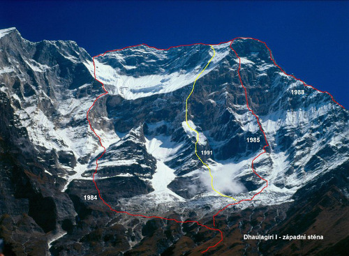 1984 Dhaulagiri, Z stěna, čs prvovýstupy červeně, žlutě Kazaši