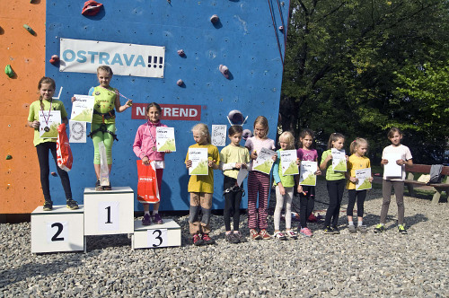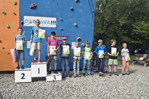 Závod tedy začíná, děti se v cestách celkem procházejí – jsou mezi nimi dost velké výkonnostní rozdíly, ale zalézt si musí i ty slabší, takže je jasné, že skoro v každé kategorii bude rozhodovat super finále a nakonec i super super finále. Už neprší a občas vykukuje i slunce. Všechno šlape, rozhodčí i jističi skvěle fungují, takže ve většině kategorií mají děti už kolem 15. hodiny odlezené všechny 4 rozřazovací cesty. Mezi dívkami E kategorie vítězí Milena Ciechanowska z GTW Glivice. Dva hoši v kategorii E se musí dále rozřadit na cestě č. 5 – obtížnosti 6+ a nakonec vyhrává Jaroslav Šikula z HO Adrenalin Prostějov. Totéž nastává i u děvčat v kategorii D, kde do superfinále postupují dokonce 4 dívky a rozřazují se na cestě č. 7 – obtížnosti 7+ a dvě z nich - Markéta Janošová z H.K. Orlová a Hana Šikulová z HO Adrenalin Prostějov dokonce na cestě č. 9 – obtížnosti 8+. Markétka cestu vylézá až do topu a svou kategorii vyhrává… V chlapecké D kategorii tomu není jinak a tři kluci také končí na cestě č. 9 – obtížnosti 8+, kde top tečuje Adam Adamovský. Děvčata Céčko se také dostala až k cestě č. 9, kterou vylezla pouze Rudka Maja – závodnice z KS Korona Krakow a vyhrává. Už je to trochu nuda :) , ale také chlapci Céčko to dopracovali až k cestě č. 9, kterou suverénně vylezl jen Jáchym Cink. V kategorii B dívky na superfinále naštěstí nedošlo a vyhrává ji Sabina Večeřová z Rocky Monkeys Sokol Brno. B chlapci končí opět na devítce, kde se výše dostává Rosťa Holíkz HO Studénka. Děvčat v kategorii B je už tradičně málo a tak se krásně rozřadí na prvních 4 cestách – první je Magdaléna Růžičková z Rocky Monkeys Sokol Brno. O to horší to je u nejstarších kluků, kde mezi sebou soupeří 2 reprezentanti Kuba Dvouletý a Kuba Konečný – oba vylézají s přehledem nejtěžší cestu č. 10 – obtížnosti 9- a vzhledem k tomu, že nic těžšího už není postaveno, musíme dle instrukcí stavěče cestu ztížit – i tak se ji oběma borců daří vylézt – jsou však upozorněni, že v případě shodného výsledku rozhoduje čas, takže o pouhé 3 sekundy vítězí Kuba Dvouletý z Vertikonu Zlín.