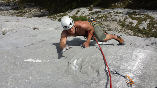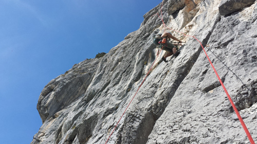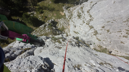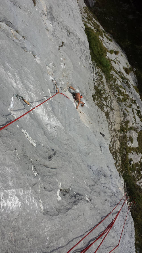 Když jsem začal díky brutál vedru mít žízeň, tak jsme zjistili, že voda a sváča je nahoře, klasika :-) Rychle zpět a pokračujem. Po 4 hodinách v sedáku a hledání kudy, jsme se museli napojit a použít 2 nýty z cesty, kterou jsme udělali naposled. Půl hodinky oraz pod stěnou a jdeme to zkusit vylézt a oklasifikovat.