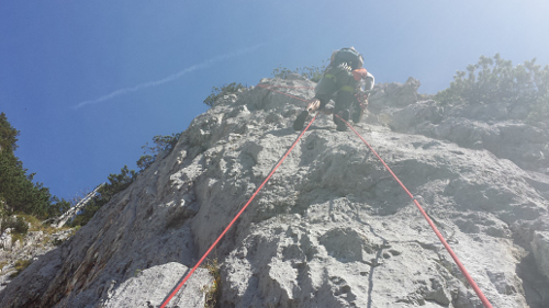 Bolest nohou je šílená, tahání batohu a zničující vedro udělá s námi své. Téměř plazící se poslední délkou za 2, jsme nahoře. Bereme jen vrtačku a jdeme k autu a do restaurace v Loferu, kde si objednáme kuře po thajsku a pivo a hned si objednáváme to samé po druhé. Trošku tam nechápou, ale hlad je hlad :-))