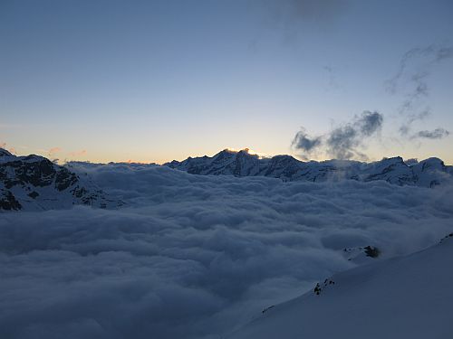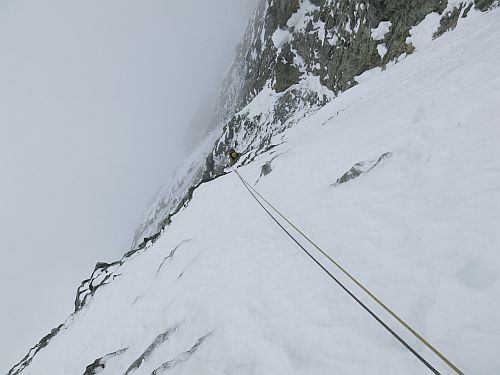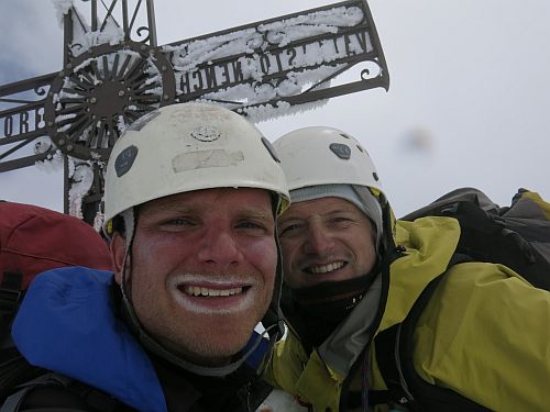 Ráno okolo sedmé vyrážíme. Předpověď slibuje slušné počasí. Začínáme ranní rozcvičkou v podobě 15 m téměř kolmého ledu s tloušťkou jen několik centimetrů. Teplota je lehce pod nulou, tak snad to celý nespadne. Dokonce drze vrtám jeden 9 cm šroub, snad unese alespoň tu expresku. Následuje ještě několik mixových délek a postupně se dostáváme na vrchní sněhové partie. Ty nás vítají skálou pokrytou 30 cm měkkého sněhu. Možnosti jištění jsou parádní, nic, nic, nic, tak já do tý rozbitý skály zkusím natlouct skobu a budeme tomu říkat štand. Postupová technika sněžné prase střídaná hraním si na Mickymouse. Po asi čtyřech hodinách těchto sněžných radovánek končíme s předstíráním jištění a zbylých asi 200 výškových metrů k vrcholu jdeme jen navázáni na laně. Sklon mírně klesá. Viditelnost je parádní, když dobře foukne je vidět i na 50 metrů. GPS naštěstí funguje, takže Italský vrchol, kříž v sedélku, dále kousek po hřebeni a pak GPS tvrdí, že jsem na vrcholu. Tak jo, je čas na formality. Vzájemná gratulace a vrcholové foto.