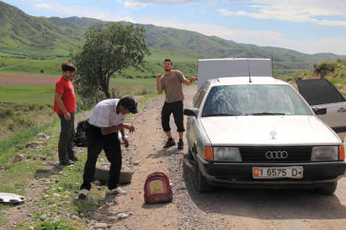 5.7.2014 v 5:30 ráno přístáváme v Biškeku, kde na nás čeká Martin s vyřízeným permitem. Na letišti domlouváme taxík do Karakolu za 4000 somů a dále na heliport Karkara, což je asi další 2 hodiny jízdy. Původně jsme měli letět z Maida Adiru, ale zjistili jsme, že naše agentura otvírá tábor až za týden, takže letíme s agenturou Ak - Sai travel do jejich tábora. Po cestě dáváme vařenou kukuřici, kterou podél dálnice prodávají ženské postávající u svých kotlíků a hlavně koupačku v Issyk kulu. Voda je příjemně studená, průzračně čistá. Je to údajně druhé největší jezero alpského typu na světě, obklopené ze všech stran horama a voda je mírně slaná. Zastavujeme na menší tržnici, kde dokupujeme poslední proviant. Na heliportu chlapíkovi předáváme kopii permitu, dáváme večeři v jurtě a stavíme stany. Helikoptéra už čeká na louce pečlivě zakrytá plachtou. Ráno v 7:00 hodin naložíme vrtulník materiálem, pytle s bramborama, satelit apod. a letíme cca 40 minut do základního tábora Jižní Inylček.