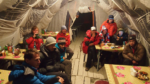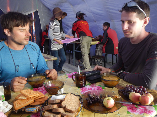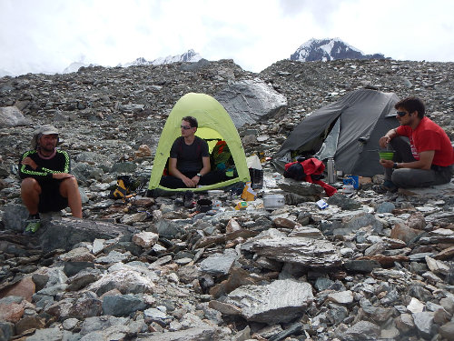 Dáváme rest v táboře, Štěpánek s Mazim nás hostí plecháčema, neb díky full paketu měli neomezený kargo. Dovídáme se, že 80 letý děda to vyhrnul až do C3 a vrátili se do C2 - neuvěřitelné. V C2 přespali ve stanu u kluků. Guidi říkají, že je to jejich Messner a právě s ním začínal Kazach Urubko a Moro na horách. Po třech dnech se děda vrací do tábora a konstatuje, že pagoda plocho sněhu po gule a my dáváme za pravdu Dimovi za jeho dobré rozhodnutí.