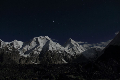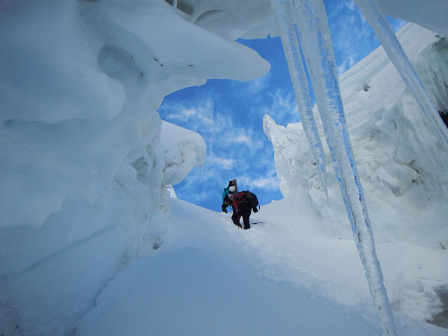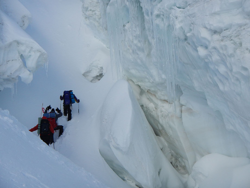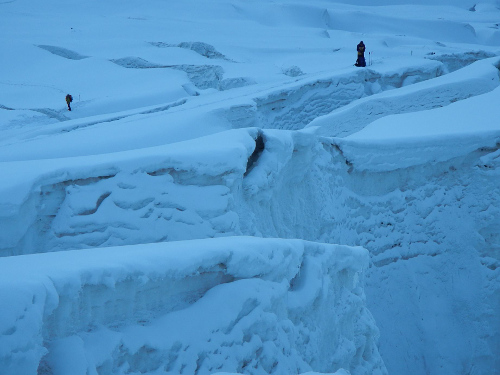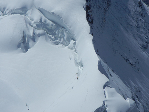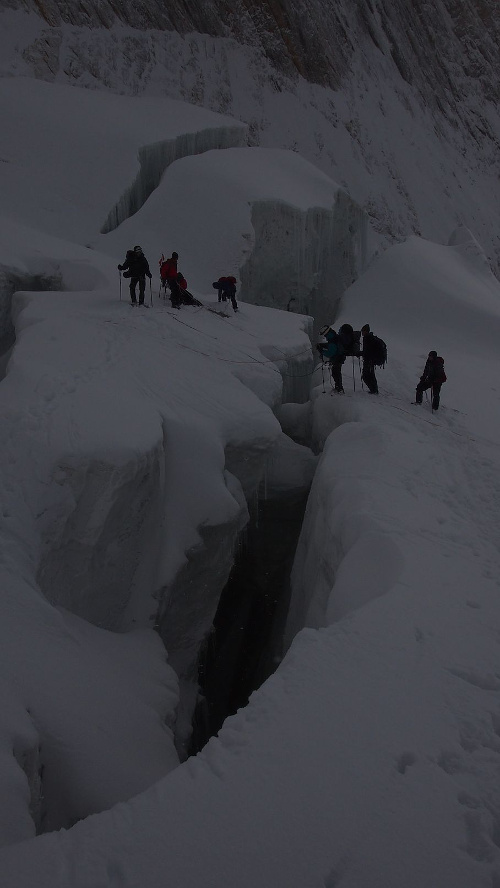Balíme a za půl hodiny už prošlapáváme stopu v hlubokém sněhu nahoru. Volíme logickou trasu při levé straně žlabu, ale postup je pomalý. Jdeme po kolena ve sněhu, padá tma a mrzne až praští. Je jasno, ale toho sněhu, střídáme se s Ondrou v prošlapávání a hledáme směr mezi obrovskýma serakama. Když se dostáváme do prudkého svahu, je tady místy sněhu víc jak popás. Je potřeba kolenama udusat sníh a pak za pomoci rukou se posunout po centimetrech dopředu. Začíná jít do tuhého, prošlapáváme z 4 900 m n.m. do 5 200 m n.m. po metrech už 6 hodin, jedním okem hledám možné místo pro záhrab, nebo stan. Najednou ve strmém svahu po pás v prašánku se se mnou propadá komplet celá plocha do trhliny. Stihnu akorát tak zařvat, pak už jenom sjíždím do útrob vymrazené trhliny. Po pár metrech se lano napíná, cukne a já se zastavuju, jenom rampouchy a led s rachotem padají dolů. Trhlina je naštěstí úzká, ubíhající šikmo do svahu. Vzepřu se nohama o stěny a hrabu se ven. Ondra volá "si v pohodě?" "jo dobrý, zamručím...", opráším se, zkontroluju cajky na sedáku. Tak tudy to nepůjde. Nahlídnu dírou do trhliny a o několik metrů vlevo se zdá, že je trhlina užší. Zkouším trhlinu přejít vedle, ale když se znovu nohou s úlekem propadám, mám toho akorát dost.