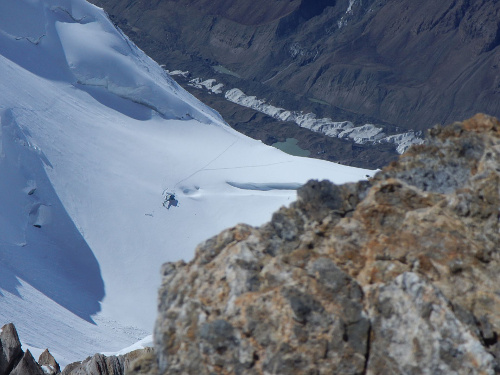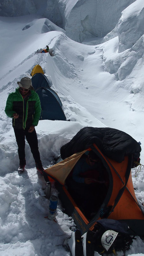 Další den vyrážíme ve stejnou dobu, zase fouká a padá. Martin se necítí a točí zpátky do C1. V cca 4 800 m n.m. nás dohání 4 guidi a ptají se na cestu. Ukazuju jim v dálce sněžný most, ale naše stopy už dávno zmizely. Zajišťují trhliny sněžnýma kotvama. Po cestĚ se nám zlomila anténa od vysílačky, tak nám kluci dávají záložní a točí dolů. Ondra se propadá do trhliny a zlomil si při tom hůlku, druhá mu spadla do trhliny, ale daří se nám jí vytáhnout smyčkou z lana. S Ondrou pokračujeme dál, ale už do žlabu praží slunko a z Čapajeva padají lavinky. Nechce se nám pod nebezpečné svahy a rozhodujeme se zůstat na vyvýšeném místě, které se jeví relativně bezpečně, nad úrovní dráhy zaklíněného seraku na Čapajevovi. Ležíme ve stanu na vyvýšené sněhovo-ledové homoli a počítáme s přesnou pravidelností pod nás zapadající lavinky z Čapajeva. V 6 h večer je relace s Dimou, říká ať pokračujeme dál do C2.