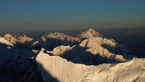 Následující den odpoledne vyrážíme směr C1 (4 200 m n.m.), cesta nám trvá asi 4 hodiny, trochu bloudíme na ledovci. Další den vstáváme ve 3 ráno a v rámci aklimatizace děláme vynášku do C2 (5 300 m n.m.). Jsme tady ale zatím jediní, hledáme cestu v ohromném žlabu v bludišti trhlin, prošlapáváme. Kličkujeme žlabem protnutým ohromnýma trhlinama jak zajíci a hledáme užší místa, která jdou přelézt, nebo sněžné mosty. Nezřídka se někdo z nás v čerstvě napadlém prašanu propadá po pas do trhliny, zastavujíce se o batoh a roztažené paže. Jsme řádně navázaní. Do C2 je potřeba se dostat do 9:00, dokud je žlab ve stínu Chána. Nejkritičtější doba je mezi 10:00 až 14:00 hodin, kdy do žlabu praží a hrozí pád seraků a lavin z vedlejšího Čapajeva, stejně jako z Chána napravo. Daří se nám prošlapat do 4 900 m n.m. pod obrovský serak, kde zakopeme mačky, žimary, plyn a mažeme rychle zpátky.