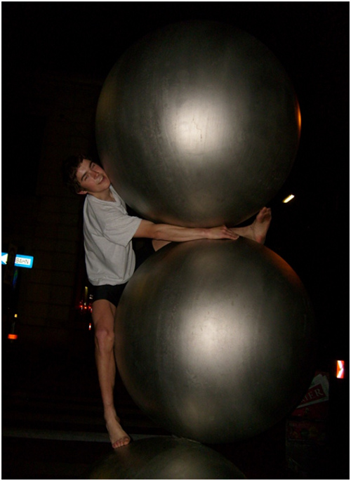 Tento boulder nazvaný „Tři koule“ patří mezi skvosty, které vypadají na první pohled lehce, ale dostat se na špici, je dávka poctivé pískařské dřiny. Petr klíní „žábu“, bohužel bezvýsledně. Tento boulder se nachází blízko centra, lezli jsme ho jen v noci.