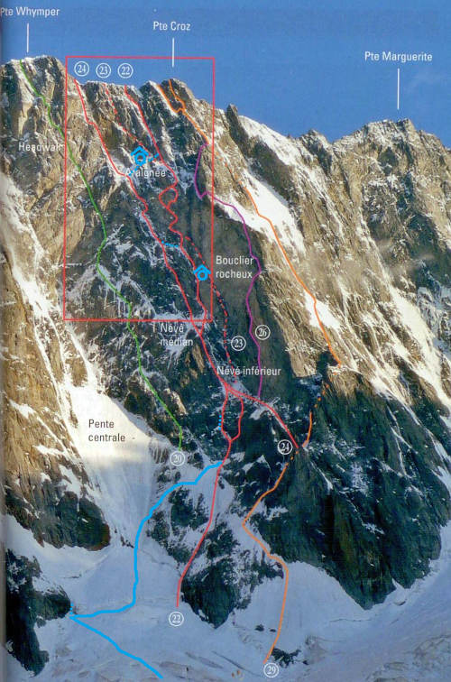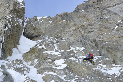 Stojím pět metrů nad posledním čokem. V kompaktních plotnách bez možnosti dalšího rozumného postupu mžourám na nákres. Hmm, pětasedmdesátka led. Ale kam se schoval? Objevuji skobu s karabinkou a nechávám se spustit níže, zřejmě jako můj předchůdce. Zkouším to o kousek vlevo. Převísek, kouteček, plotna, stopka. Pár metrů ještě více vlevo se macatí ledové koutky cesty Bonatti-Voucher. Ranní oklepávání a dva pokusy do neznáma nás stály spoustu času a my se potřebujeme dostat na to sněhové pole nad námi, kde je parádní dvoulůžkový bivak. Takže ještě kousek traverz, ták a jsme v Bonattim! Jen dvě-tři délky tu pobudeme a hned jak to půjde, tak zase uhneme.
