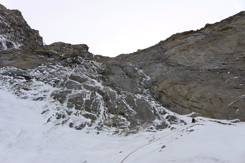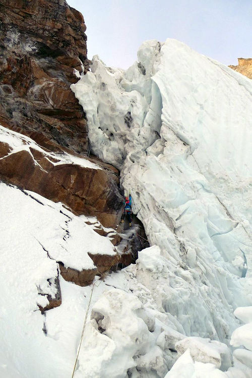 Bača se pokouší o nemožné při překonávání převisu okrajové trhliny, což se o chvíli později potvrdilo. Cesta nakonec vedla úplně jinudy.