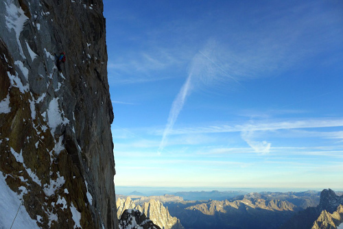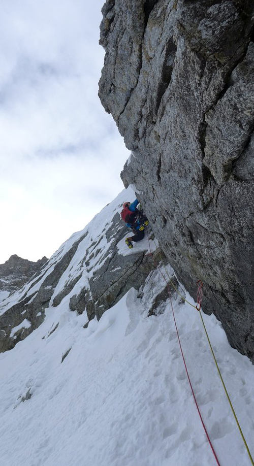 Stoupa po úhybu do Bonattiho. Sníh se na ukloněných plotnách neudrží, ale pod převisy ano.